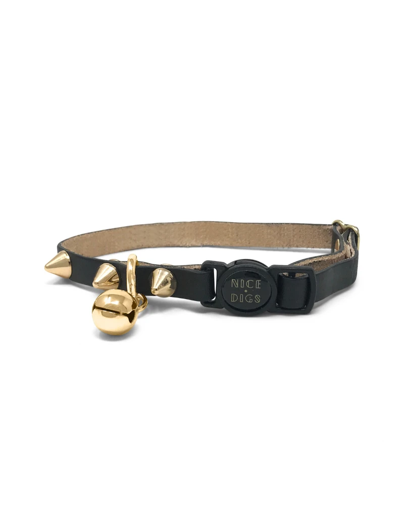 NICE DIGS cat collars are handcrafted with lightweight yet durable vegetable-tanned leather, finished with their signature gold bell & safety release buckle.