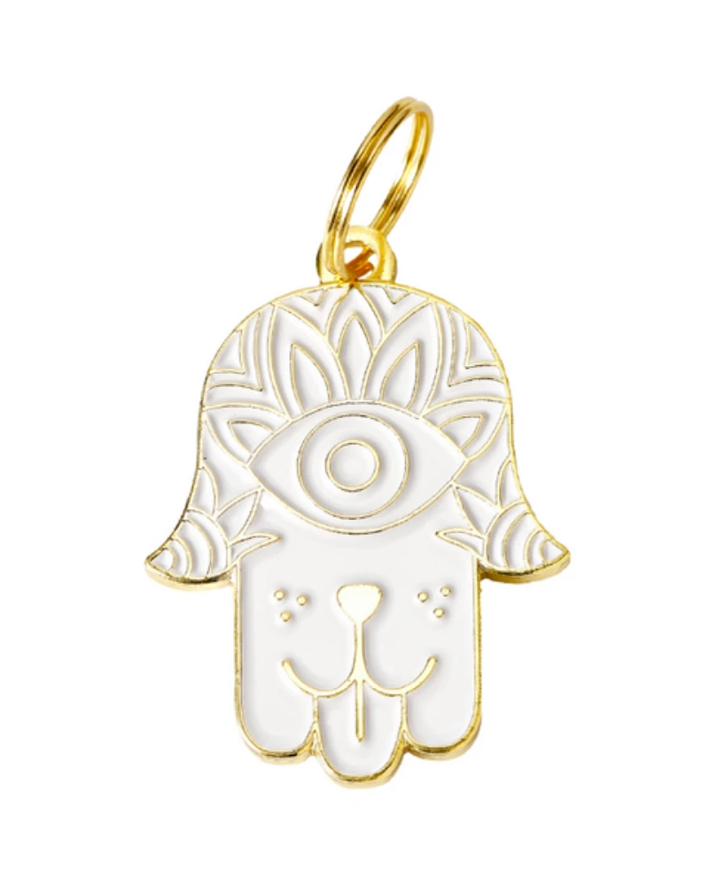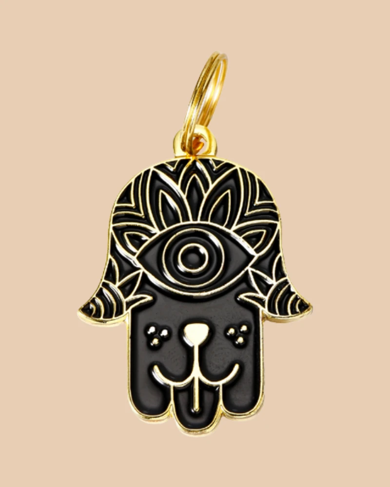 Protect your pooch from the evil eye with this dog-faced Hamsa. Keep away bad spirits. Bring in happiness, health, and puppy kisses.ย