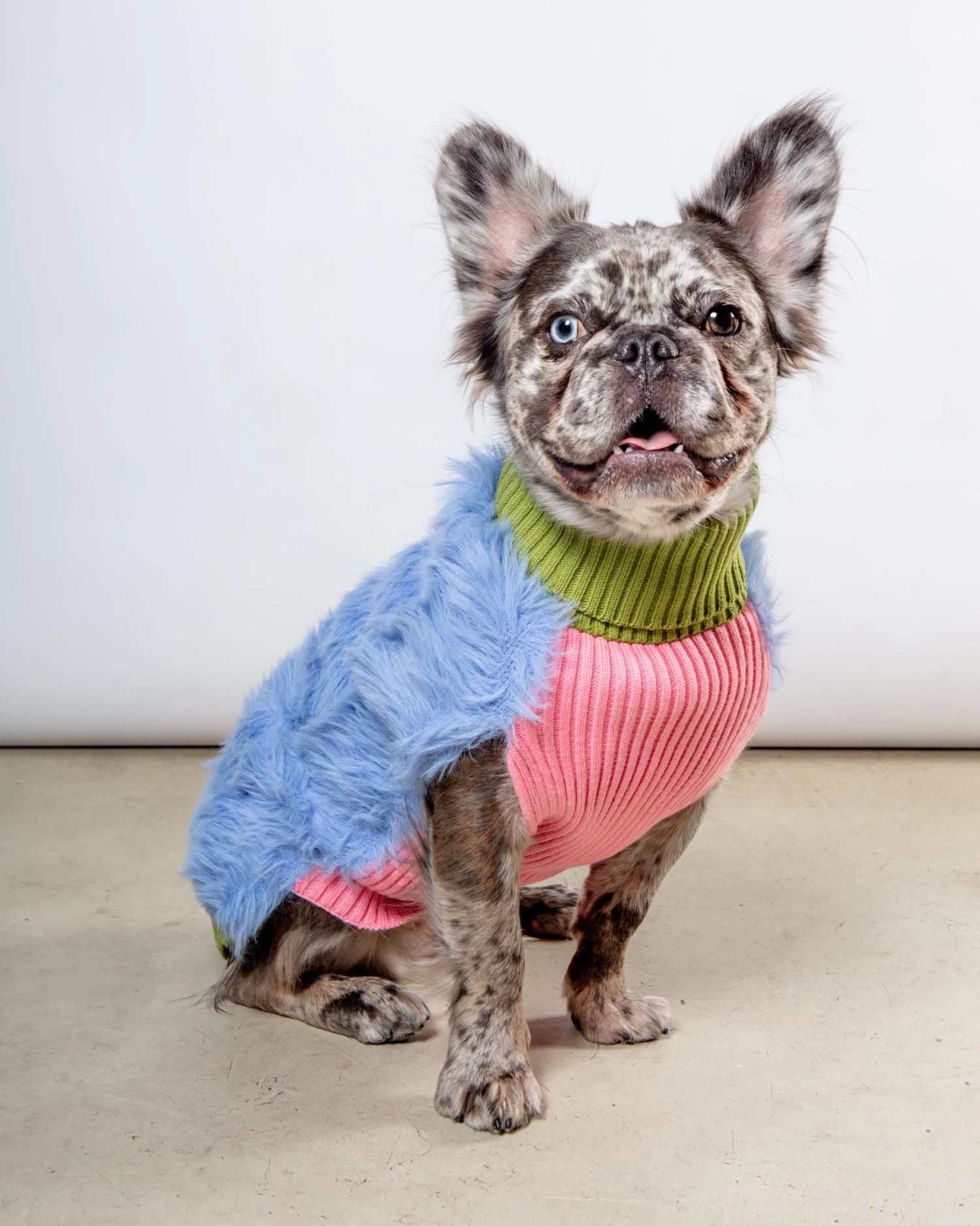 Soft faux fur knit dog sweater with contrast ribbed underside and turtleneck collar. Harness keyhole on back. Hypoallergenic, washable knit.